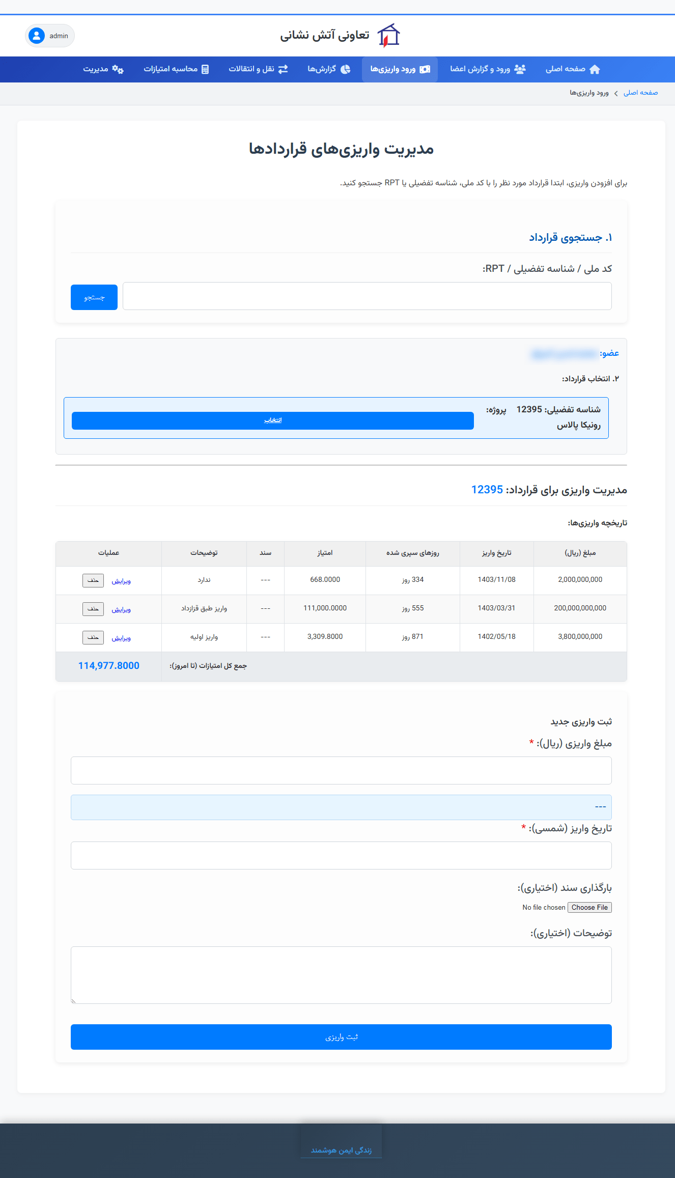 - سیستم مدیریت مالی و واریزیها: ثبت ریز واریزیهای اعضا با تاریخ دقیق، امکان ویرایش و حذف واریزیها با هشدارهای امنیتی (SweetAlert) جهت جلوگیری از خطای کاربری.